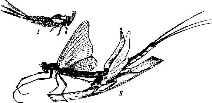 Поденка. I - личинка Cloeon dipterum; II — линька субимаго на имаго