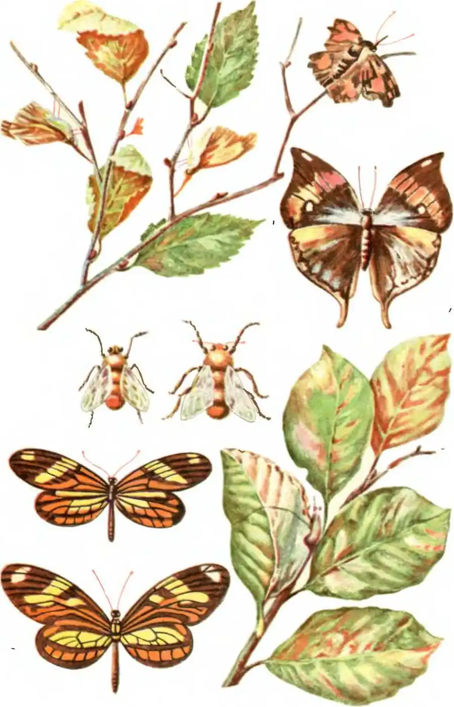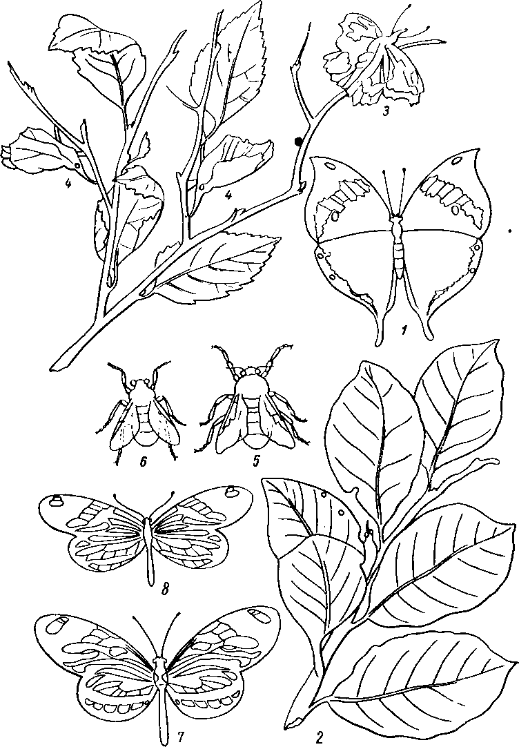 Предохранительная окраска и форма насекомых. 1—2, 3—4 - случаи предохранительной окраски и формы, 5—6 — 7—8 — случаи мимикрии: / —Kallima с расправленными крыльями сверху, 2 — она же, сидящая на ветке среди листьев, 3— Libvtliea celtis с расправленными крыльями, 4 —они же со сложенными крыльями, 5 — Bombus semenowi (перепончатокрылые), 6 — Portschinskia przewalski (двукрылые), 7 — Lycorea halia ( геликонида), 8 - Dismorphia astynonico