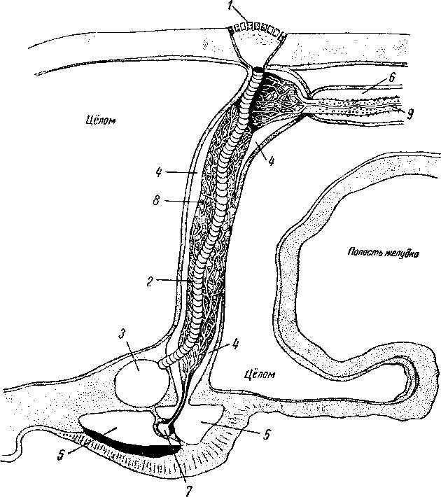 1—мадрепоровая пластинка, 2—каменистый канал, 3—кольцевой канал амбулякральной системы, 4— осевые каналы псевдогемальной системы, 5—кольцевые каналы этой системы, 6 — половой канал этой системы, 7 — кольцевой канал кровеносной системы, 8 — осевой орган, 9— аборальный кровеносный сосуд