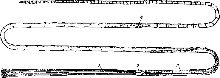 1 — передний отдел тела со щупальцевым аппаратом, 2—средний отдел тела, 3 — задний отдел тела, прикрепительные подушечки