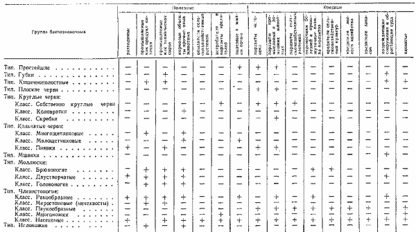 Изложенные выше данные более наглядно представлены на прилагаемой таблице, из которой ясно видно многообразие практического значения беспозвоночных и разнообразие важных в практическом отношении групп.