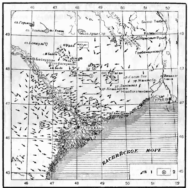 Схема ориентировки бэровских бугров, гряд и увалов в Северном Прикаспии (составил Т. Ф. Якубов по личным исследованиям и картографическим материалам).