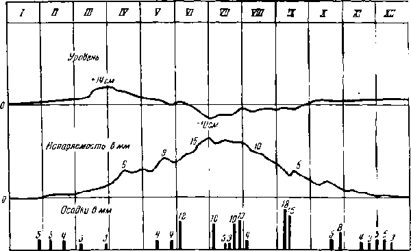Кривая колебаний уровня пресной грунтовой воды в песках урочища Беткен, Хошеутовские пески, 1913 г. (по Томашевскому, 1931).