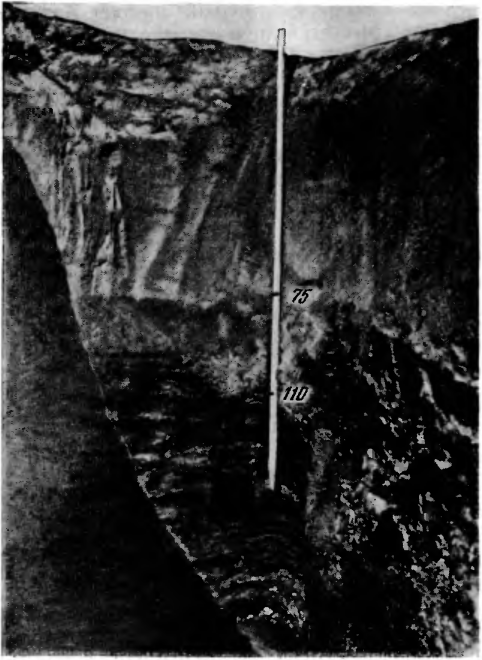 До 75 см палево-серый песок. На глубине 75—110 см суглинок бурый, глубже — песчано-глинистая слоистая толща. У грунтовой воды (2 м) прослойка ракушек.