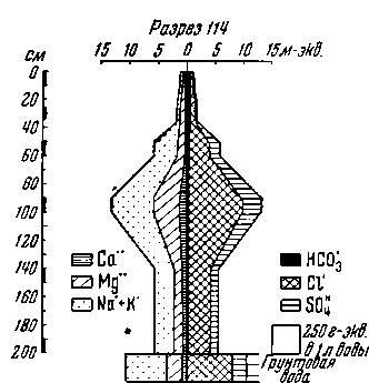 При однотипном характере корневой системы и при более или менее однородном механическом составе, но при близких грунтовых водах, профиль засоления расширяется с глубиной и достигает максимума у зеркала воды. В случае глубокого залегания грунтовой воды максимальное скопление солей наблюдается в зоне наибольшего сосредоточения корней растений. Наши разрезы 109 и 114 служат наглядной иллюстрацией обоих указанных случаев. Это положение, разумеется, относится к песчаным почвам, обладающим определенной водоподъемной способностью, и не исключает существования других форм солевых профилей в зависимости от глубины грунтовых вод, характера растительности и вариаций механического состава.