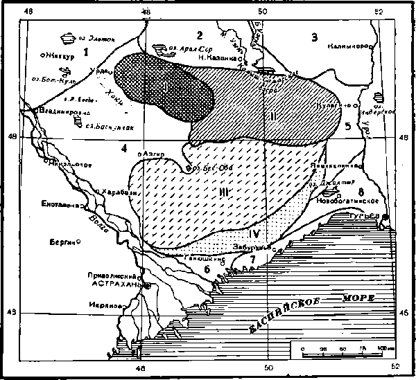 I — Урдинаский (Нарынский); II — Джангалинский; III — Кошалакты-Мынтюбинский; IV — Денгизский (Приморский).