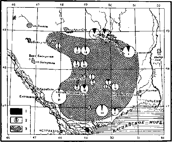 Отложения типа с большим содержанием роговой обманки располагаются в восточной части массива песков Северного Прикаспия. Они, по-видимому, связаны с системой р. Урал и потому названы нами условно уральской областью седиментации.