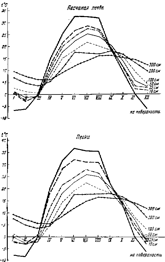 О ходе изменения температуры на различных глубинах песка и песчаной почвы дают представление приводимые в таблице показатели, полученные Хошеутовской метеорологической станцией в 1916 г. (Томашевский, 1931), а также рис. 88, составленный по данным той же таблицы.