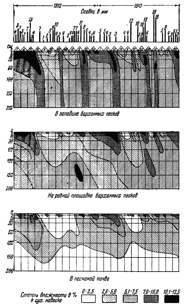 Чтобы показать характер увлажнения песков, приведем результаты наблюдений И. И. Томашевского над влажностью песков в 1912—1913 гг. на территории Хошеутовского участка в следующих условиях: 1) на ровной площадке в барханных песках, 2) в западине барханных песков и 3) в бурых песчаных почвах с полынной растительностью. Результаты этих наблюдений изображены в виде хроноизоплет на рисунке.