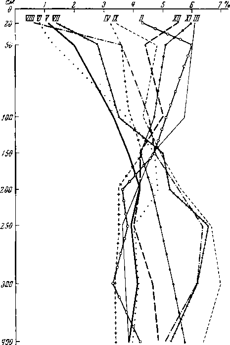 Что касается бугров и барханов, то в них, как видно и в таблице, летом (с мая по август) до глубины 0,5 м влажность не превышает 3%, а глубже она колеблется от 3 до 4—6%.