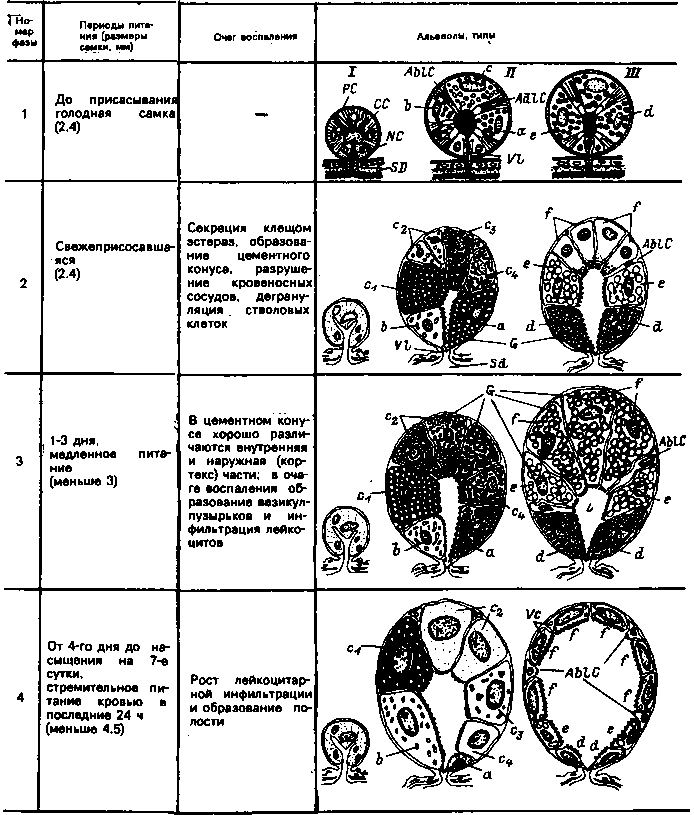 Типы клеток, их изменения в процессе питания и значение этих изменений видны на рис. 11 —17. Рис. 11 и 17 отражают различия в строении гранулярных и агранулярных клеток клещей представителей подсемейств Amblyomminae и Ixodinae. Функции клеток слюнных желез, их значимость для возбудителей и обратный процесс — влияние возбудителя на переносчика, зависящее от возбудителя, видны из таблиц.