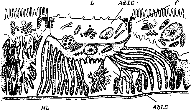 L — просвет альвеолы; f — вакуолесодержащая клетка; AdlC— клетка-колпачок; AblC—водяная клетка, заполненная грубой и гладкой эндоплазматической сетью с активными увеличенными в объеме митохондриями; HI — гемолимфа