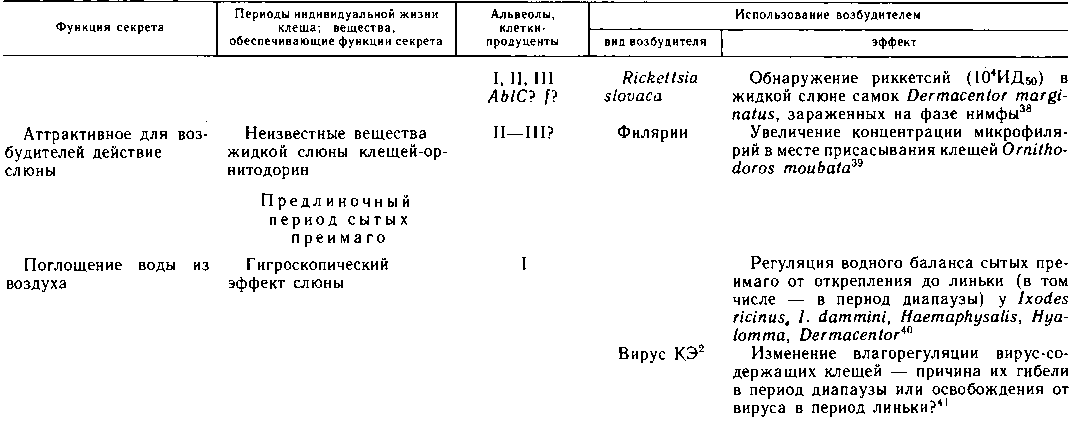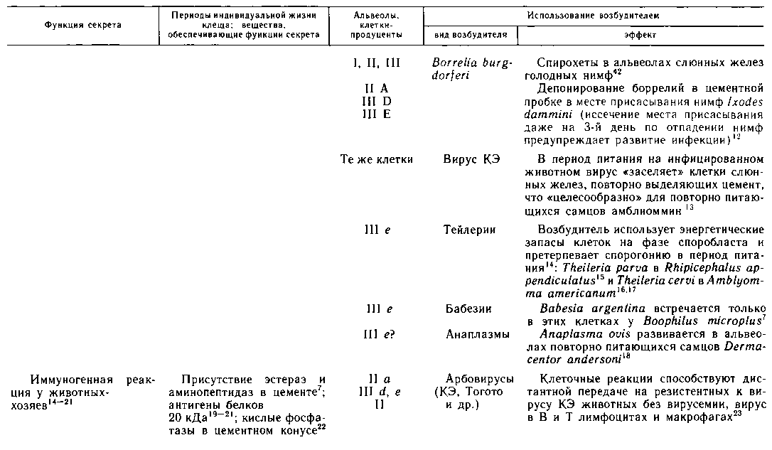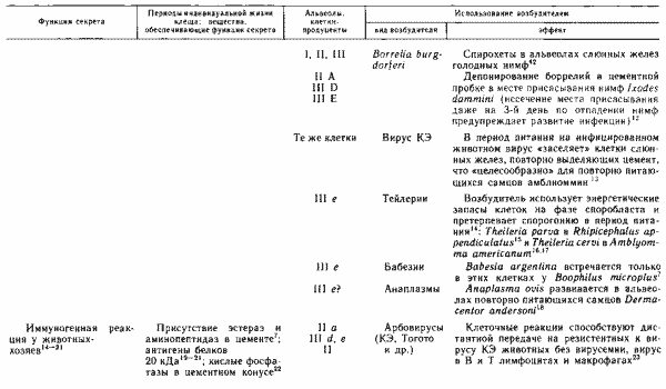 Примечание. Н. д.— нет данных. 1 — Needham et al., 1990, 2 — Стефуткина, 1989; 3 — Feldman-Muhsam et al., 1970; 4 — Алексеев,; 5 — Binnington, Stone, 1981; 6 — Binnington, 1978; 7 — Binnington, Kemp, 1980; 8 — Moorhouse, Tatchell, 1966; 9 — Балашов, 1979; 10 — Алексеев, Чунихин, 1990a; 11 — Nosek et al., 1972J 12 — Pollack et al., 1991; 13 — Алексеев, Чунихин, 19906; 14 — Walker, Fletcher, 1985; 15 — Binnington et al., 1983; 16 — Hazen-Karr et al., 1987; 17 — Kocan et al., 1988; 18 — Kocan, Stiller, 1992; 19 — Shapiro et al., 1986; 20 — Brown, Askenase, 1986; 21 — Jaworsky et al., 1990; 22 — Gill, Walker, 1988; 23 — Jones, Nuttall, 1991; 24 — Venable et al., 1986; 25 — Shapiro et al., 1989; 26 — Ribeiro et al., 1985; 27 — Ribeiro, Spielman, 1986; 28 — Ribeiro, 1987; 29 — Walker,-Fletcher, 1986; 30 — Walker, Fleicher, 1987; 31 — Ribeiro, Weis, Telford, 1990; 32 — Ribeiro et al., 1987; 33 — Подборонов и др., 1975; 34 — Tatchell, 1967; 35 — Meredith, Kaufman, 1973; 36 — Kaufman, Sauer, 1982; 37 — Балашов и др., 1972; 38 — Diehl et al., 1980; 39 — Wirtz, Barthold, 1986; 40 — Kahl, Knulle, 1988; 41 - Benda, 1958; 42 — Zung et al., 1989; 43 — Sigal et al., 1991; 44 — Алексеев, Подборонов, Буренкова — неопубликованные данные.