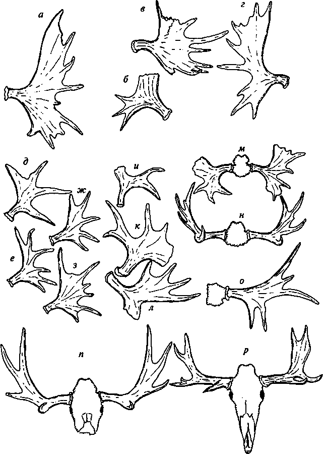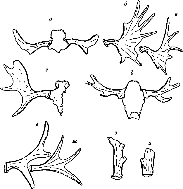 Остатки рогов ископаемых и субфоссильных Alces. а — окр. г. Мытищи, голоцен, ГМ РАН; б, в — Восточная Европа (?), голоцен (?), ГМ РАН; г — окр. Москвы (?), плейстоцен—голоцен, ЗМ МГУ; д — Предкавказье [Верещагин, 1949]; е, ж — A. a. cf. caucasicus [Верещагин, 1959]: е — низовья р. Дон, Саркел, ж — Краснодарский край, р. Уруп; з, и — Alces sp., Западная Сибирь, Красный яр, плейстоцен [Алексеева, 1980].