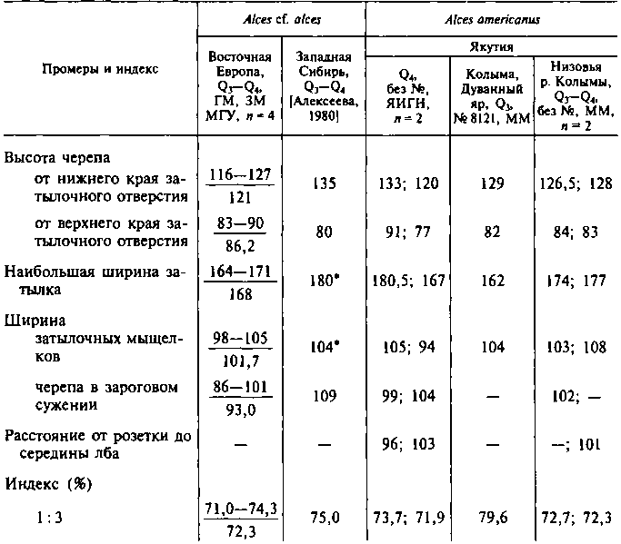 а — Германия, Шуссенрид, поздний вюрм [Kahlke, 1956; Шер, 1971]; б — Германия, Бавария, голоцен (ПММ); в — Дания, голоцен, N° 27772 (АМЕИ); г — Австрия, г. Брук, голоцен (ПММ); д—л — "Alces palmatus", Румыния, плейстоцен [Macarovici, 1961]; м, н — Западная Украина, плейстоцен [Верещагин, 1967]; о — Великий Устюг, плейстоцен (?) [Верещагин, Русаков, 1979]; n — "Alces fossilis", окр. г. Мытищи, поздний плейстоцен—голоцен, p — "Alces savinus", Среднее Поволжье, средний плейстоцен (?) (оба — [Pavlow, 1906]).