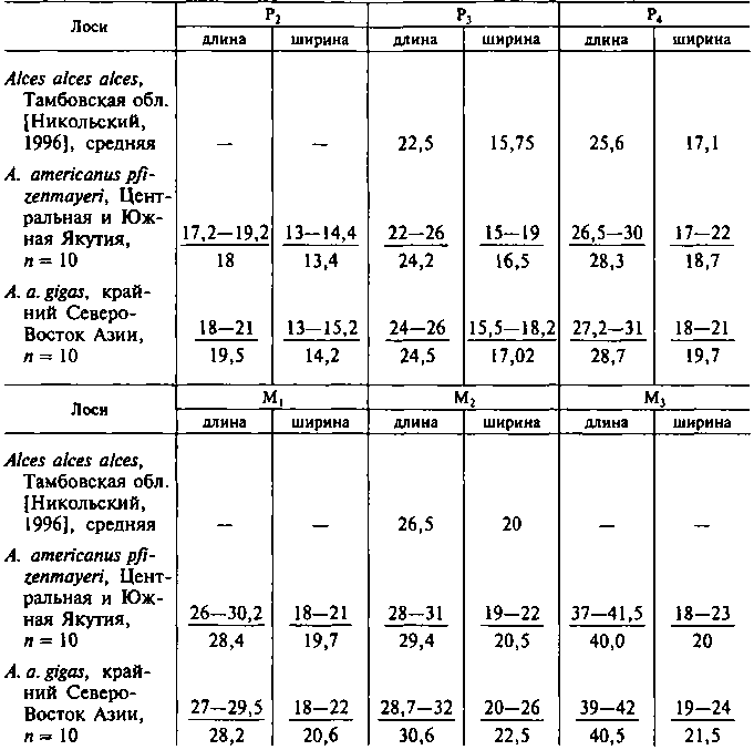 Описание и сравнение. Промеры ископаемых и субфоссильных остатков черепов лосей с Северо-Востока Азии входят в пределы размерных вариаций современных лосей, обитающих на территории Якутии, но ближе к показателям наиболее крупного современного подвида A. a. gigas. Наибольшими размерами отличаются ископаемые и субфоссильные лоси с Аляски. Размеры нижних челюстей также свидетельствуют о том, что ископаемые и субфоссильные Alces из Якутии относились к крупной форме, однако аляскинские лоси превосходили их по размерам. Примечательно, что для позднеплейстоценовых и голоценовых A. americanus характерно удлинение ряда коренных зубов. Размеры самих зубов якутских лосей входят в пределы изменчивости современных A. a. pfizenmayeri и A. a. gigas; размеры зубов аляскинских сохатых превосходят параметры последних.