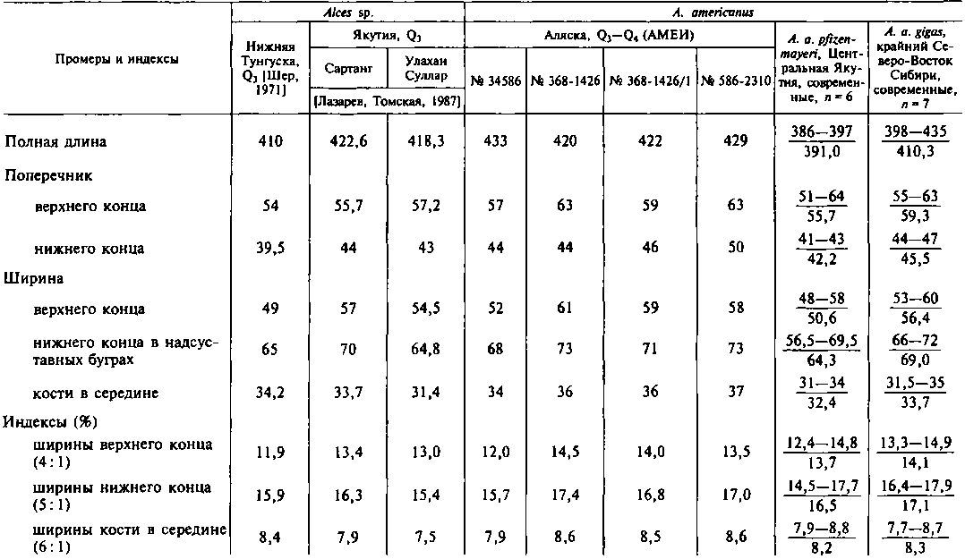 Исследованный нами материал по настоящим лосям в АМЕИ относится по каталогу этого музея к ранчолабреа. Костные остатки аляскинских лосей минерализованы в той или иной степени и имеют цвет от темно- до светло-коричневого. Мы условно отнесли эти материалы к концу позднего плейстоцена — началу голоцена.