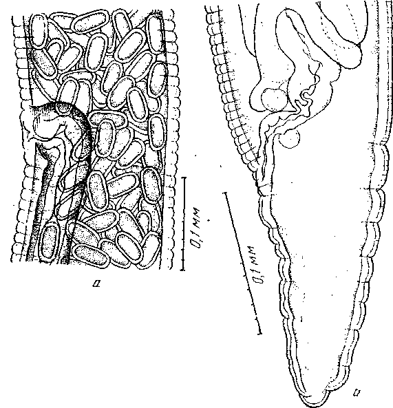 а — область вульвы; б — задний конец самки
