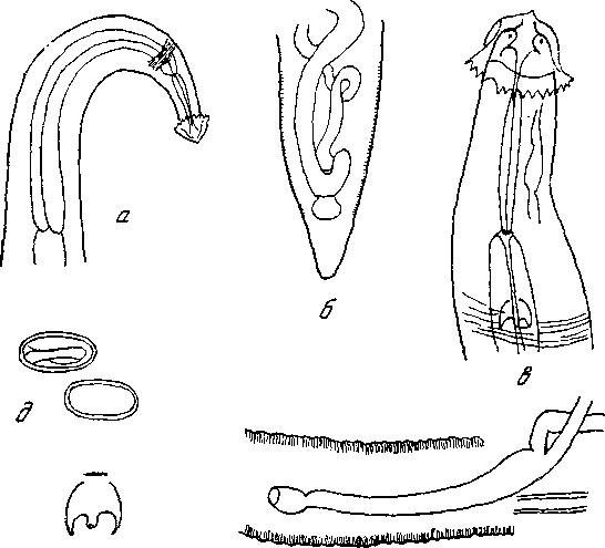 а — передний конец; б — задний конец самки; в — передний конец латерально; г — область вульвы; д — яйца; е — цервикальный сосочек