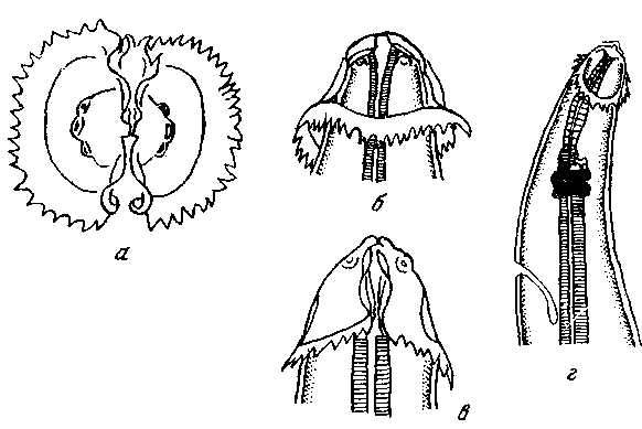 a — головной конец апикально; б — головной конец латерально; в — головной конек медианта; г — передний конец тела латерально