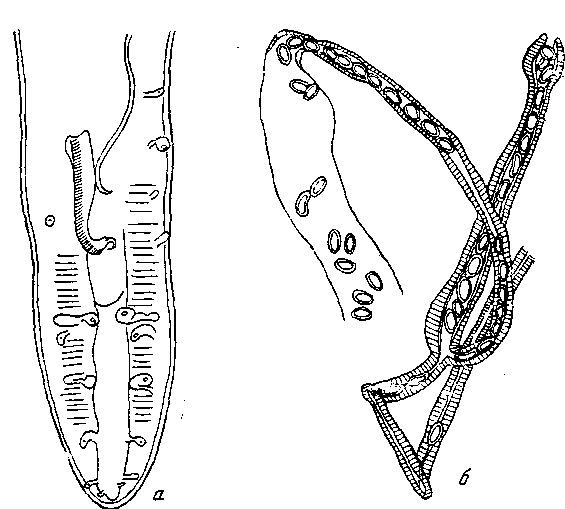 а — хвостовой конец самца; б — яйцемет и часть матки