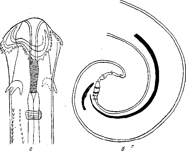Самец. Тело прозрачное, беловатое. В задней части закрученное. Длина 12,5—13,6 мм, наибольшая ширина 0,25—0,28 мм. Каждая латеральная губа снабжена острым зубом, с внутренней стороны направленным кпереди. Головные эполеты сердцевидные, достигают около 0,090 мм в дорзо-вентральном диаметре, их окаймляют свыше тридцати острых шипов. Трехвершинные зубцы около 0,050 мм длины, их основание отстоит на 0,110—0,117 мм от переднего конца тела на уровне задней части фаринкса. Боковой двойной ряд шипов, достигающих 0,018 мм, начинается на уровне нервного кольца, центральная часть которого лежит на расстоянии 0,20—0,24 мм позади головного конца. Экскреторное отверстие расположено на расстоянии 0,27 мм от переднего конца. Фаринкс 0,15—0,18 мм длины и 0,018—0,021 мм ширины, тонко поперечно исчерчен. Передняя часть пищевода 0,65—0,77 мм длины и 0,035—0,050 мм ширины. Задняя часть пищевода 3,55—4,45 мм длины и 0,09—0,100 мм ширины, снабжена клапаном, выступающим в кишечник. Хвост закручен вентрально, 0,25 — 0,28 мм длины с тупым концом. Хвостовые крылья начинаются около 0,15 мм кпереди клоаки и простираются до конца хвоста, поддерживаясь с каждой стороны четырьмя ребровидными преанальными и тремя постанальными сосочками, из которых последний находится на расстоянии 0,040 мм от конца хвоста. Кроме того, пара сосцевидных сосочков лежит посередине тела позади клоаки, кнутри от хвостовых крыльев. Спикулы неравные, с очень узкими боковыми крыльями. Правая достигает 0,20— 0,23 мм длины, левая 0,96—1,0 мм длины.