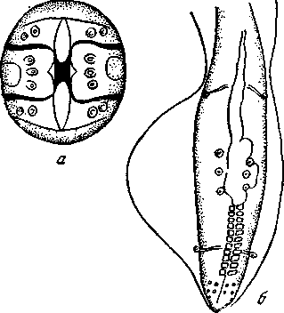 очень мелкие, лежат на кончике хвоста; 6-я пара — стебельчатая; 7-, 8-и 9-я пары расположены на трехлопастном кутикулярном придатке, лежащем по обе стороны клоаки, который продолжается в виде желоба до передней части хвостового крыла, где расположена 10-я пара стебельчатых сосочков. В промежутке между маленькими пятью парами сосочков и 7-й парой этот медианный желоб снабжен по обе стороны одиннадцатью прямоугольными кутикулярными щитками. 10-я пара сосочков удалена на значительное расстояние от группы периклоакальНых сосочков (7—9-я пары). Спикулы неравные. Их строение Драше не имел возможности изучить.