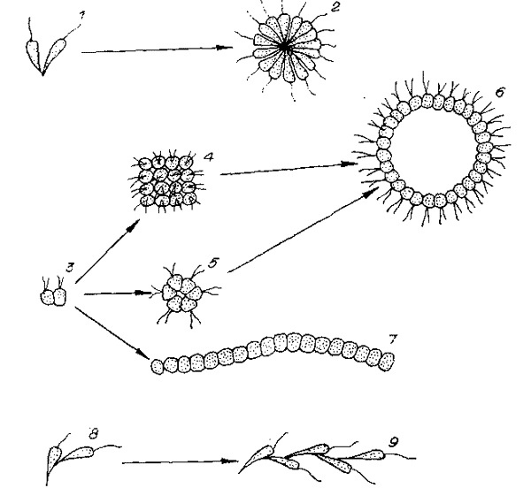 1 — соединение «конец в конец», 2 — схема «радиальной» колонии, 3 — соединение клеток «бок в бок», 4 — табличная колония, 5 —мелкая сферическая колония, 6 — бластееобразная колония, 7 — цепочка клеток «конец в бок», 8 — соединение «конец в бок», 9 — древовидная колония.