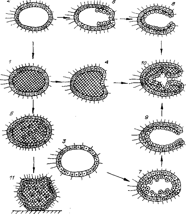 1 — бластея с опорным гелем внутри, 2 — бластея без опорного геля, 3 — бластея по И. И. Мечникову (клетки без кинетид — макрофаги), 4 — бластея с первичной инвагинацией, 5 — генитопаренхимелла с опорным гелем, 6 — то же, без геля, 7 — фагоцителла, 8 —«зпителпзация» генитопаренхимы, 9 — эпителизация фагоцитобласта, 10 — протогастреада, 11 — примитивная губка.