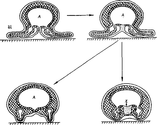 Поперечные срезы протоцеломического животного в период замыкания середины щелевидного бластопора.