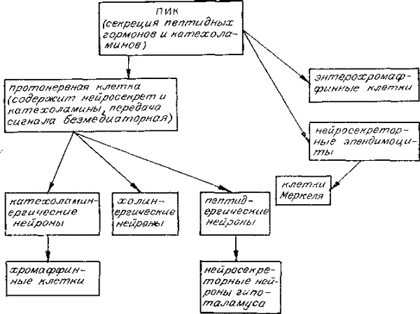 Отдельный источник их развития в онтогенезе не показан, а в филогенетическом смысле они представляются особой формой примитивного нейрона. Филогенетические преобразования клеток, приведшие к возникновению нейронов, рассмотрены нами ранее. Не повторяясь, представим эти сведения в виде схемы.