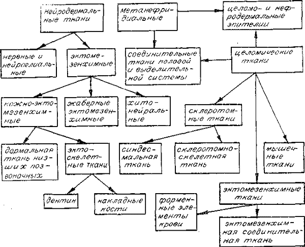 Ткани, выделяемые в классической гистологии, выделены по морфофизиологическим основаниям. Поэтому, взяв в качестве отправной точки дефинитивные ткани высших позвоночных в том виде, в каком они обычно выделяются, мы неявно введем в генетическую классификацию морфофизиологические критерии и получим, в сущности, комплексную, а не генетическую классификацию. Конечно, генетическая классификация в итоге должна привести нас к тканям морфофизиологических классификаций и показать их родство. Но более общие понятия генетической классификации должны быть филогенетическими. Они могут совпадать или не совпадать по объему с тканями классической гистологии. Система таких понятий мало разработана, и потому предлагаемая нами схема требует обширных пояснений.