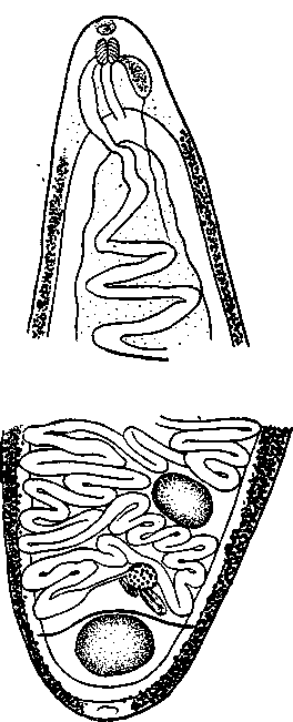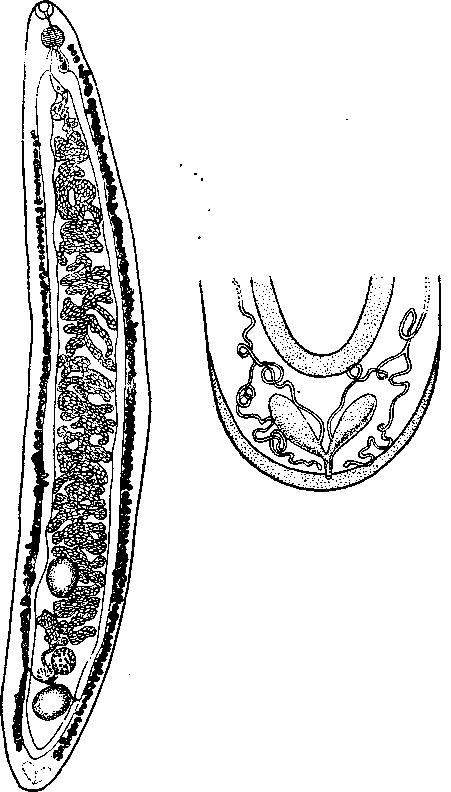 Передний семенник, 1.05 X 0.68 мм, лежит с правой стороны; задний, 1.25 X 0.99 мм, располагается в кишечной дуге и отделяется от яичника расстоянием в 0.5 мм. Половая бурса колбовидная, ее узкая часть (0.28 X 0.06 мм) лежит поперечно; задняя же расширенная часть достигает 0.55 X 0.27 мм и не доходит до разветвления кишечника.