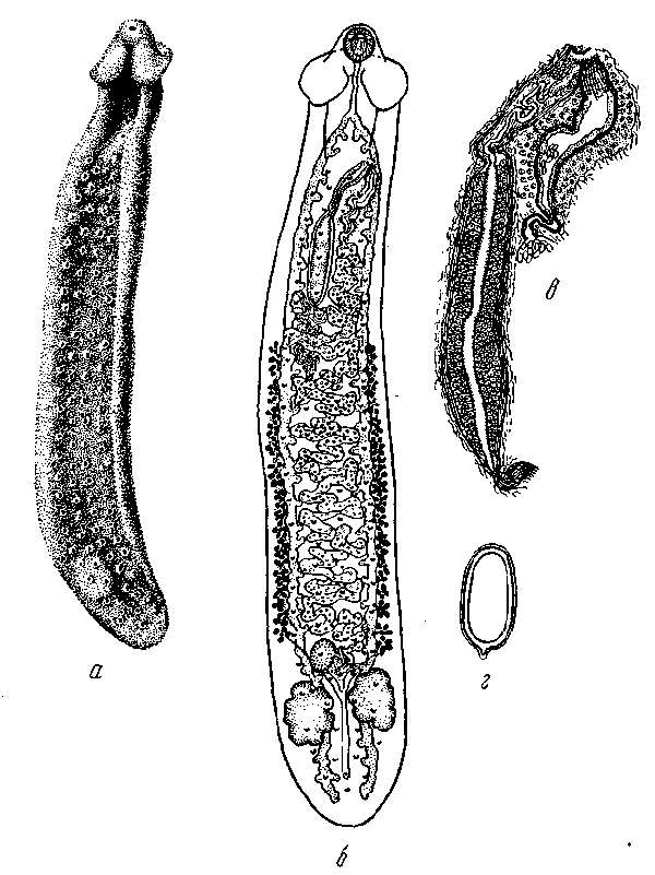 а - марита (внешний вид с железами); б — внутреннее строение мариты; в — концевые элементы половой системы; г — яйцо