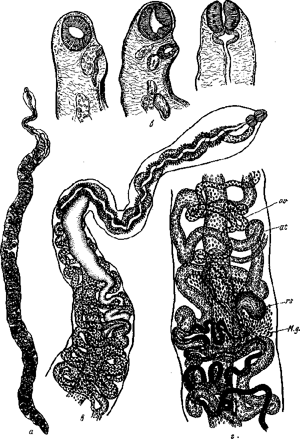 а — марита; б — срезы через головные концы; в—передний конец тела; г — часть тела с половыми органами. M. g.—тельце Мелиса; rs —семяприемник; ov —яичник; ut — матка