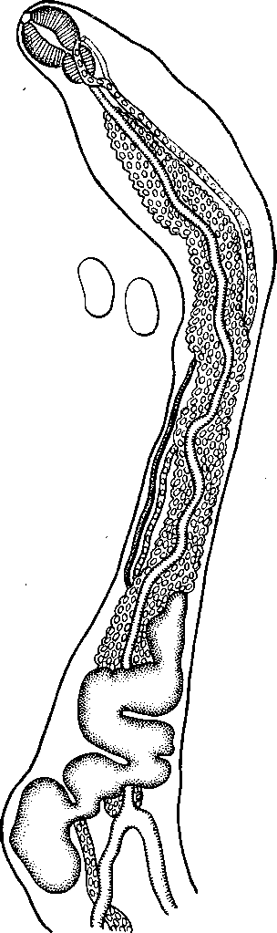 Все эти петли лежат поверхностно. Приблизительно на середине заднего отдела тела матка становится прямой и идет к отверстию vas deferens.