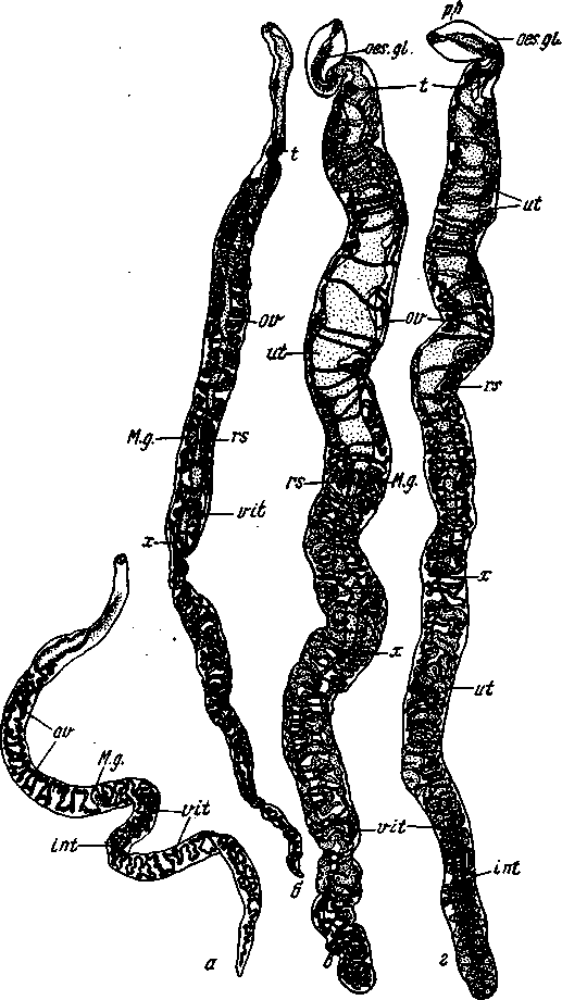 a — молодая особь; б — взрослый экземпляр, пол которого не определен; в — марита с преобладанием женских органов; г — марита с преобладанием мужских органов; х — начало расширения матки; ul — матка; rs — семяприемник; t -семенник; vit — желточник; ini — кишечник; м. д.— тельце Мелиса; ov — яичник; ves. gl.— пищеводные железы; рh — фаринкс.