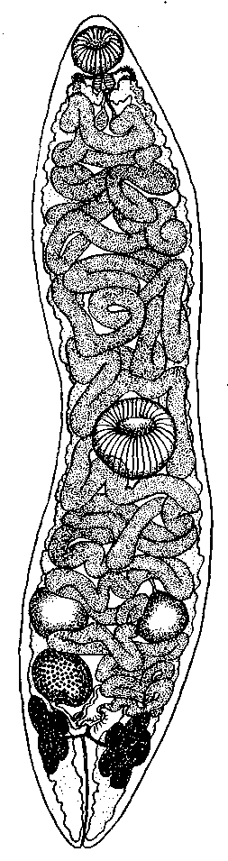 Описание вида (по Инглу, 1936). Тело имеет перетяжку в области брюшной присоски. Длина тела 1,5—2,0 мм, ширина 0,52—0,70 мм. Кутикула гладкая. Ротовая присоска субтерминальная; ее длина 0,14—0,16 мм и ширина 0,17—-0,29 мм. Фаринкс непосредственно следует за ртом и достигает в длину 0,07—0,10 мм при ширине 0,08 мм. Пищевод короткий. Кишечные стволы направлены сначала вперед, а затем тянутся назад. Брюшная присоска большая, почти круглая, диаметром 0,30 —0,38 мм, находится в передней половине тела. Соотношение размеров ротовой и брюшной присосок как 0,41—0,53 : 1. Семенники лежат по диагонали на середине расстояния между брюшной присоской и яичником.