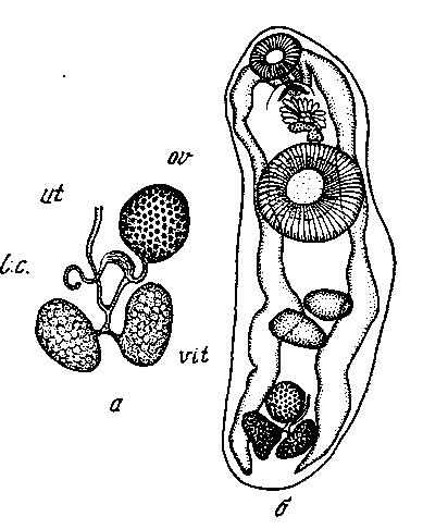 а- женская половая система; б — общий вид мариты; t. с.— лауреров канал; ov — яичник; ut — матка; vit — желточник