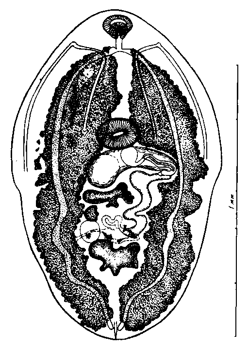 Внутренний семейной пузырек разделен на две части. Циррус короткий, вооружен шипиками. Наружного семенного пузырька нет. Половое отверстие лежит вентралыю от левого кишечного ствола, несколько впереди переднего семенника. Яичник расположен субмедианно, в промежутке между семенниками, а иногда медианно, непосредственно впереди заднего семенника. Желточники, состоящие из мелких фолликулов, начинаются обычно кпереди или слегка кзади от брюшной присоски и доходят до заднего конца тела.