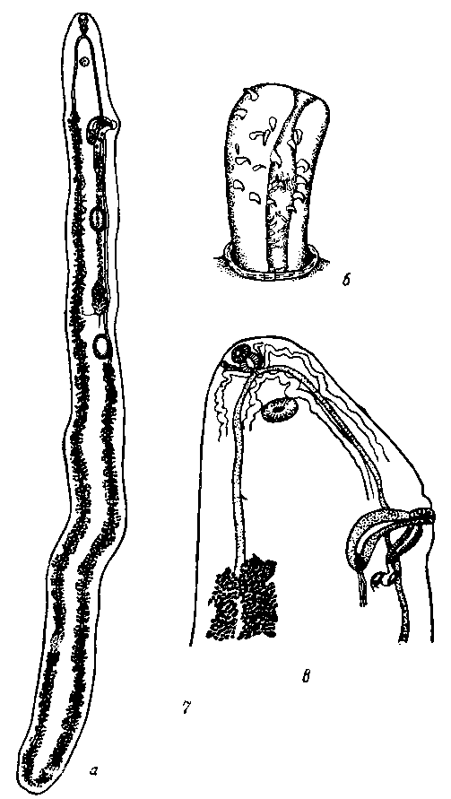 а — марита; б — вооруженный циррус; в — передний конец тела с латеральным положением полового отверстия