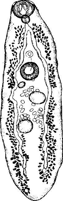 Кишечные стволы переходят за уровень расположения заднего семенника, но не достигают заднего конца тела. Диаметр брюшной присоски 0,25 мм. Центр ее отстоит от переднего конца на расстоянии 0,93 мм. Семенники расположены наискось друг к другу, в центральной части тела паразита, причем передний семенник прилегает к левому кишечному стволу, а задний — к правому. Передний семенник располагается е самой середине длины тела паразита, задний отделен от переднего значительным интервалом, заполненным петлями матки.