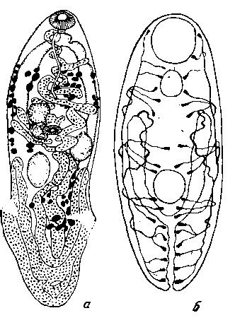 a — марита (по Оденингу, 1958); б — экскреторная система метацеркария (по Оденингу, 1960)