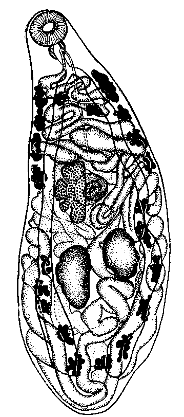 Семенники крупные, лежат в задней части тела, ближе к брюшной присоске, чем к заднему концу, по двум сторонам медианной линии тела; они овальные или слегка удлиненные, особенно задний; передний семенник 0,529 X 0,379 мм, задний — 0,668 X 0,346 мм. Половая бурса трубчатая, очень длинная, мощно развитая; семенной пузырек слегка изогнут па обоих концах; половое отверстие лежит на уровне фаринкса. Яичник образует на своем наружном крае 5—6 лопастей; он лежит в дорзальной области, на уровне брюшной присоски, несколько сбоку. Семяприемник очень крупный, 0,68 мм в диаметре, округлой формы, расположен вентрально относительно яичника.