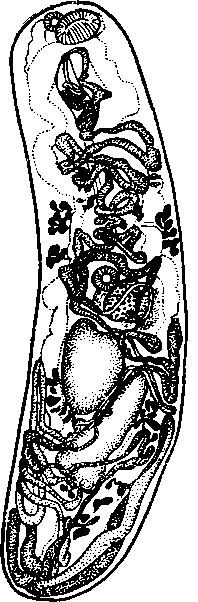 Хозяева: лягушки — Rana catesbiana, R. clamitans, R. pipiens sphenocephala Cope.