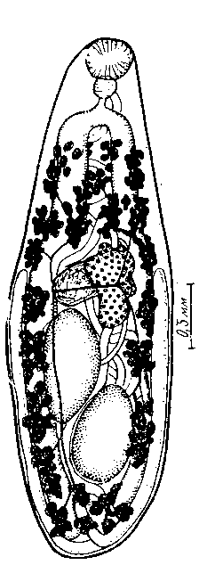 Описание вида (по Харвуду, 1932). Трематоды средней величины; тело удлиненное, сплющенное, суженное к переднему концу и закругленное сзади. Наибольшая длина тела — 10 мм, однако средняя — около половины этой длины, наименьшая длина половозрелых экземпляров 1,1 мм. Ширина тела 1,2—1,6 мм. Кутикула гладкая, на всем протяжении без шипиков. Она крайне топкая, 0,004 мм. Ротовая присоска крупная. Отношение размеров ротовой присоски и фаринкса равно 1 : 2; фаринкс бывает иногда немного меньше, но соотношение не бывает ниже 2 : 5. Отношение размеров ротовой и брюшной присосок близко к 1 : 3. Брюшная присоска расположена слегка впереди середины тела. У трематод 5,4 мм длины брюшная присоска находится на расстоянии 2,4 мм от переднего конца тела. У растянутых экземпляров пищевод, несколько длиннее фаринкса. Широкие кишечные стволы простираются до заднего конца тела.