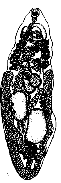 Его передний край располагается или на уровне центра брюшной присоски или между ним и передним краем последней, причем справа он граничит и с присоской и с семяприемником. Длинная ось яичника, лежащая в косом (спереди назад и справа налево) направлении к медианной линии тела, равна 0,6064—1,0161 мм, а короткая — 0,5409—0,7868 мм. Передний край яичника отстоит от переднего конца тела на расстоянии 3,8188—3,8824 мм, а задний отделен от переднего семенника промежутком около 0,1639— 0,9014 мм.
