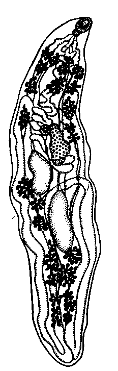 Овальной или яйцевидной формы яичник лежит впереди семенников, непосредственно рядом и слева от брюшной присоски.