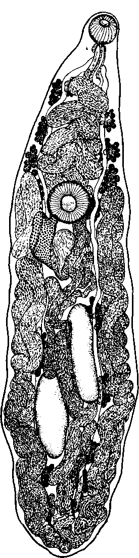 Желточные фолликулы сгруппированы в виде 16—20 розеток, начинаясь на некотором расстоянии позади бифуркации кишечника; они расположены с неравномерными промежутками по обеим сторонам тела, дорзально от кишечных стволов и матки; более тесно они скопляются впереди брюшной присоски и у окончаний кишечных стволов. Нисходящая проксимальная и восходящая дистальная части матки ограничены областью между кишечными стволами, тогда как средняя часть, описав по одной петле с каждой стороны тела, доходит до уровня брюшной присоски или идет несколько дальше.