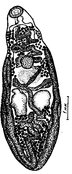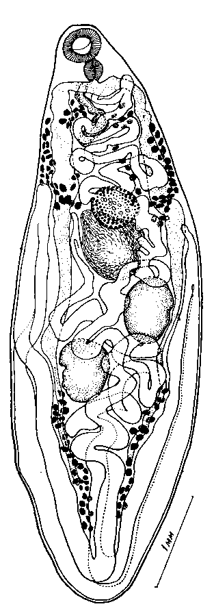 Neohaematoloechus neivai (Travassos et Artigas, 1927) от Leptodactylus ocellatus (по Доббину, 1957)